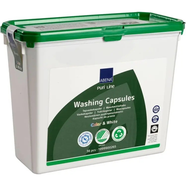 Puri-Line þvottahylkin frá ABENA eru notendavæn lausn sem einfaldar þvottinn með því að tryggja rétta skömmtun af þvottaefni í hvert sinn, sem skilar áreiðanlegum þvotti á öllum fatnaði, handklæðum og rúmfötum; til að nota þau er mælt með að setja eitt hylki neðst í tromluna fyrir venjulegan þvott, en tvö hylki ef fötin eru mjög óhrein, vatnið hart eða þvotturinn mikill, og mikilvægt er að setja hylkin undir fötin, en aldrei í þvottaefnisskúffuna. Hylkin henta bæði fyrir hvítan og litaðan þvott.